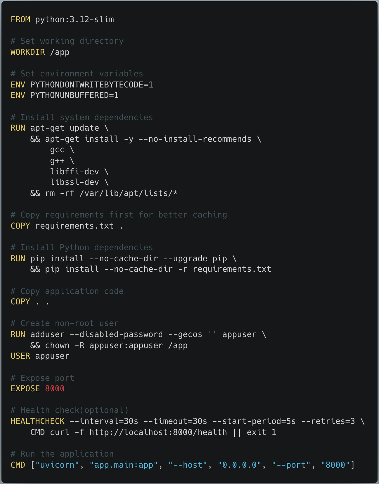 This alignment — same Dockerfile, same Compose config — is what makes deployment predictable, even as a one-person team.